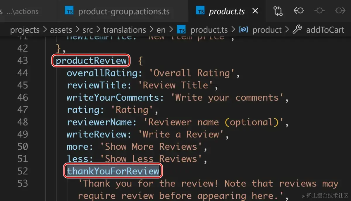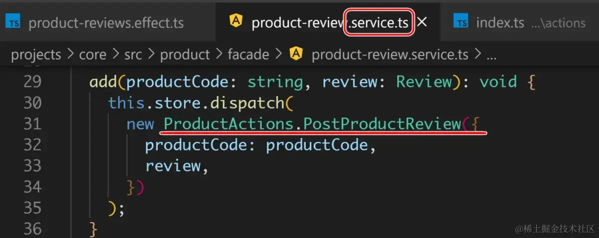 - Action:其实就是编程领域的事件的别名。SAP Commerce Cloud UI 组件,能响应用户操作,通过组件的 Service 实例,投递出相应的 Action. Action 投递方和 Action 接收方是解耦的,彼此感知不到对方。 下图是 SAP 电商云产品明细页面评论区域的 Submit 按钮被点击之后,对应的 Service 类抛出 PostProductReview Action 的代码: