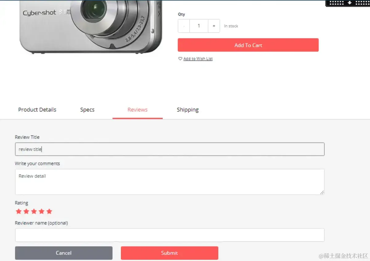 这个需求的背景是,客户在 SAP 电商云的产品明细页面,可以留下自己的评论,点击 Submit 按钮提交。