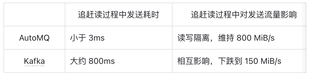 在 AutoMQ 性能白皮书中,我们详细对比了 Kafka 与 AutoMQ 在追赶读时的性能表现。结果见下表: