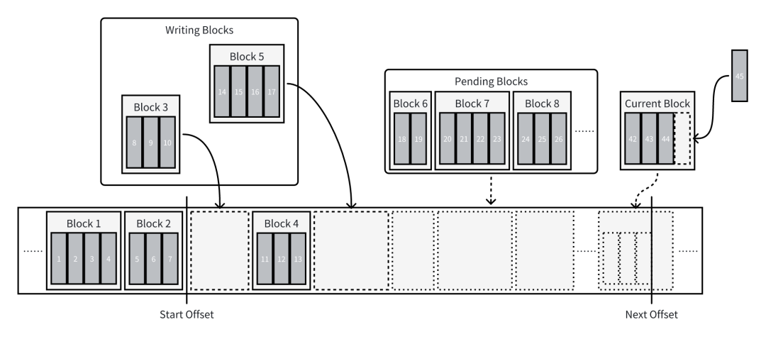 currentBlock:最新的 Block。需要写入的 record 会被放入该 block 中,该 block 同时会负责分配新 record 的逻辑位点。当 currentBlock 写满时,会被放入 pendingBlocks,同时新的 Block 会被创建并成为 currentBlock。