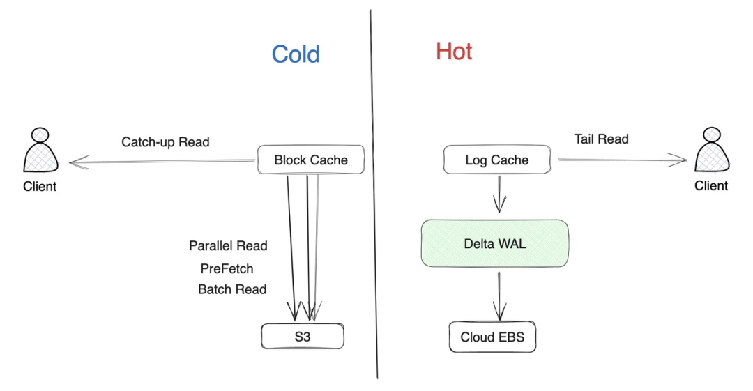 AutoMQ S3Stream 设计了冷热隔离的缓存 Log Cache(缓存新写入数据)和 Block Cache(缓存从对象存储中拉取的数据)。Log Cache 中的数据在 WAL 的数据没有上传到对象存储之前在内存中不会失效。如果从 Log Cache 无法读取到数据,则改为从 Block Cache 中读取数据。Block Cache 会通过预读、批量读等手段保证冷读时读取数据也尽量在内存命中,从而确保冷读时读取的性能。