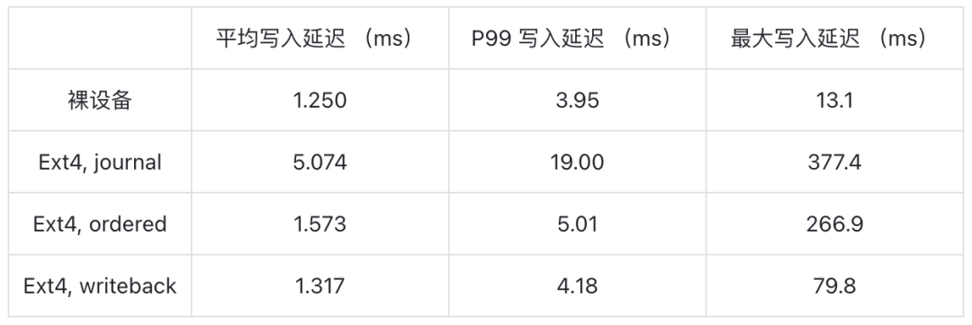 绝大多数文件系统在读写时都会有一定的额外开销:比如文件系统的元数据操作、记录 Journal 等。这些操作会占用一部分磁盘的带宽与 IOPS,同时写入路径也会变得更长。而使用裸设备进行读写,避免了这些开销,写入延迟更低。下表对比了在文件系统与裸设备上进行写入的性能表现。可以看到,相较于文件系统,裸设备的写入延迟明显更低,性能更好。