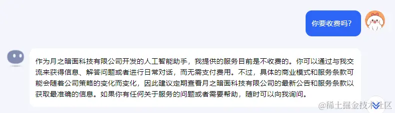 现在kimi还是免费的,大家赶紧冲,整体还是可以的,经过体验之后,感觉生成速度稍逊于chatGPT3.5( PS:大家有想体验chatGPT4.0/plus的吗?这里有一个特别简单的方式可以供大家参考chatgpt升级juejin.cn/post/734351… 如果遇到消息发不出去可以参考:一定可以解决的五种方法解决消息发不出去 juejin.cn/post/734391…
