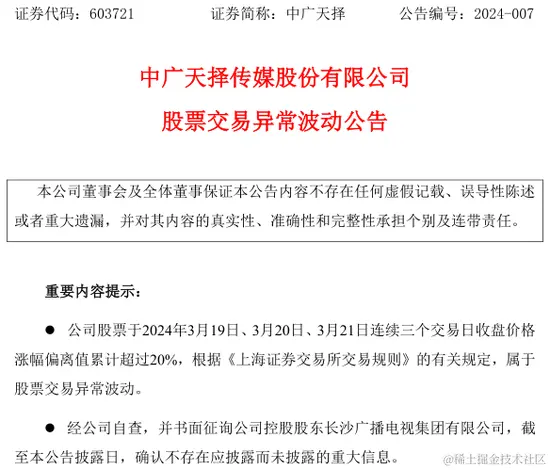 回看资本市场,面对短期的市场热炒,3月21日晚间,包括中广天择在内多家公司均在股票异动公告中对Kimi相关概念予以澄清和回应。 中广天择主要从事综艺、纪录片、影视剧、短视频等视频内容的生产和运营。“近期,有媒体报道公司涉及‘Kimi概念股’,目前公司跟Kimi没有合作。公司有出售视频版权给从事大模型业务的客户,但不涉及相关AI业务及AI技术。”中广天择在3月21日晚间的异动公告中提示称。