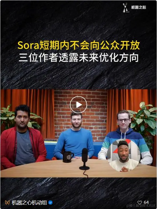 当然,技术解读上的深入浅出只是采访的一部分,另一部分始终围绕着安全、担忧这样的大众话题。比如,一段 20 秒的 720p 视频,不需要几个小时的生成时间,只要几分钟,Sora 在安全方面又将采取怎样的举措?
