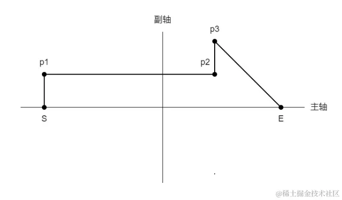 想要计算出三个点的坐标,就需要知道 主轴和副轴的角度(副轴是与主轴垂直的一条直线)以及 Sp1、p1p2、p2p3这三条边的长度。