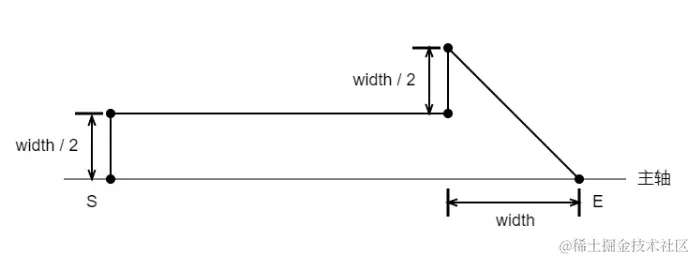 所以Sp1 = width/2 p1p2 = length - widt p2p3 = width/2 ,其中length是箭头的总长度,可以通过起点与终点坐标计算出来。现在我们就可以计算出三个中间点的坐标了。