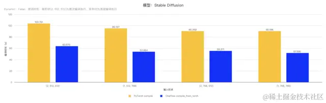 相对 PyTorch compile 接口的编译时间,使用 OneFlow compile_from_torch 接口的编译时间更短,另外得益于 OneFlow 框架中极致的算子优化,在 Stable Diffusion 模型上有更优的执行性能(*