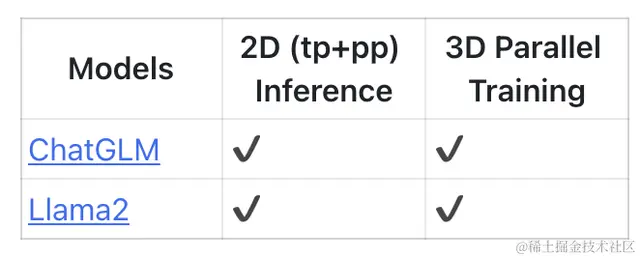 ChatGLM 和 Llama2 的分布式训练和推理支持情况如下: