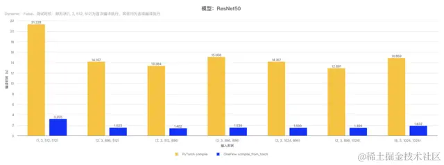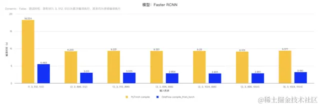 具体而言,对 ResNet50 模型和 Faster RCNN 模型的 backbone 部分使用 OneFlow compile_from_torch 和 PyTorch compile 接口进行编译并执行,测试不同形状输入时的编译时间,结果如下表:
