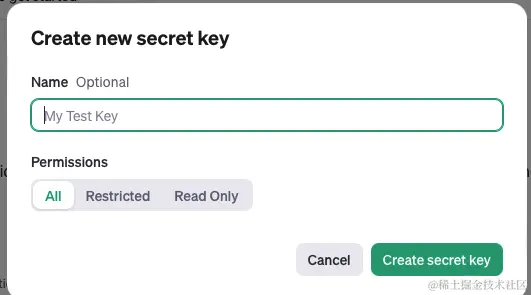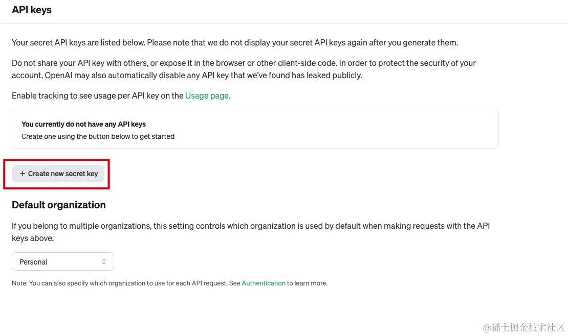 Create new secret key来创建API keys