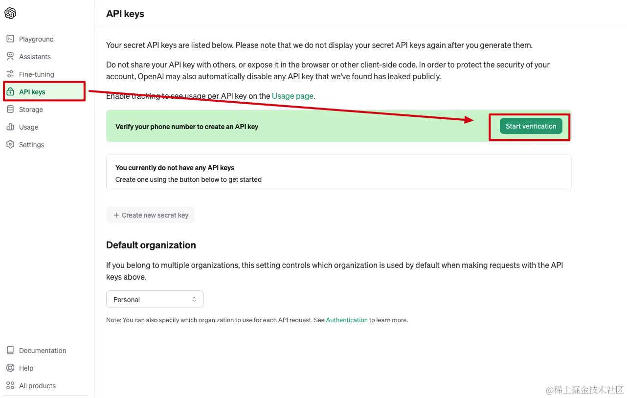 openAI开放平台:platform.openai.com,点击左侧API keys,右侧提示需要验证手机号,点击Start verification