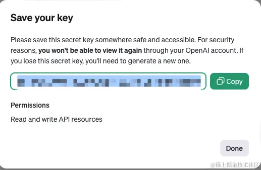 - 成功创建时弹框中将展示您的secret key,请在此时妥善保存,因为secret key只会在此时完整展示,之后都不会再显示secret key的内容了。