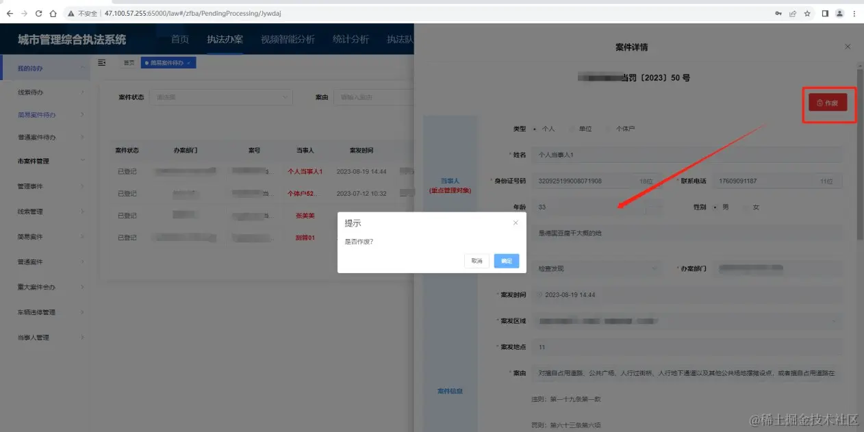 支持通过案件状态、办案部门、案由、案发时间进行查询,