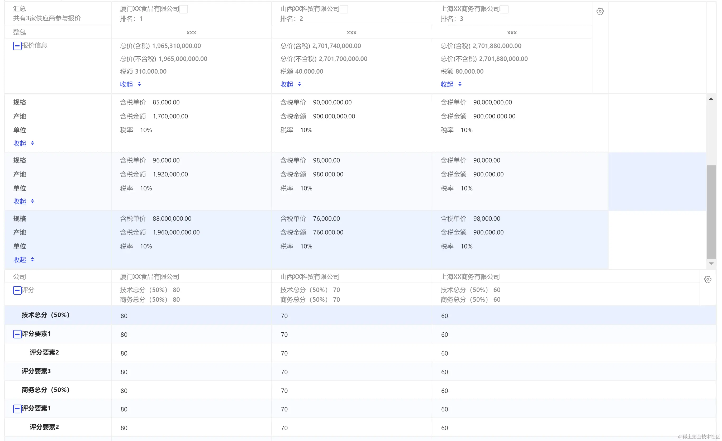 开发人员快速构建表格,将同一家供应商的多字段信息一屏展示,用户可以对不同维度间的数据直观的对比。让用户更直观的了解信息,收起不关注的已读字段,更高效的处理工作。