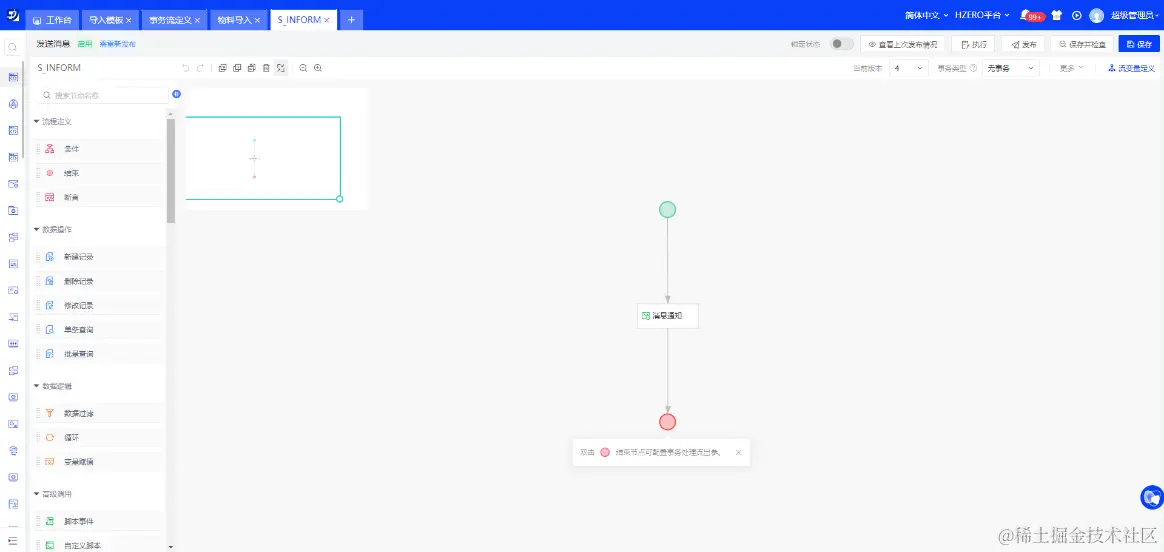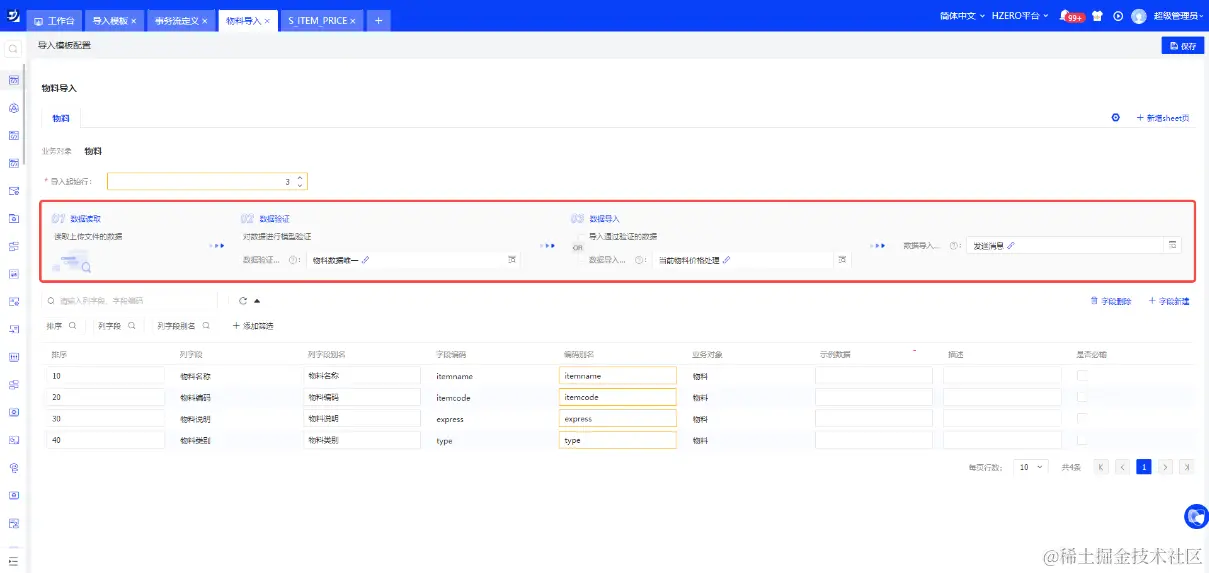 再比如本地物料数据进行导入时,根据业务需求,需要先进行数据验证:物料类别名称为“浮动价格物料”的数据需要保证编码唯一;验证通过之后,需要查询每条物料数据的最近一次执行价格,并将该价格写入每条数据的【当前物料价格】字段中进行导入;导入成功之后发送消息通知给相关负责人。