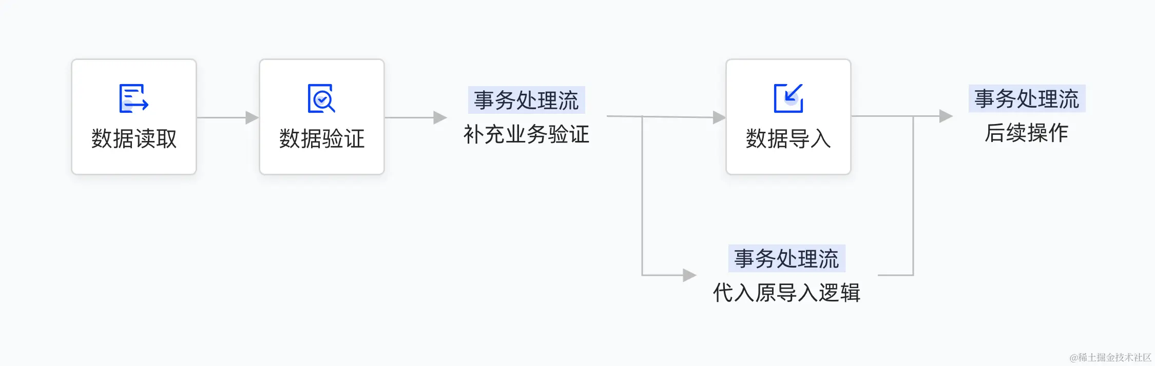 数据导入的流程主要分为三步,先是数据读取,读取之后进行数据验证,验证通过之后进行数据导入,在这三步之间可以调指定事务处理流来完成一些特殊需求,例如在数据导入之后可以调事务处理流进行一些业务逻辑上的补充验证;验证通过之后可以调事务处理流来代替原本的系统导入来将数据导入到指定对象中;在导入完成之后调事务处理流发送消息通知等。