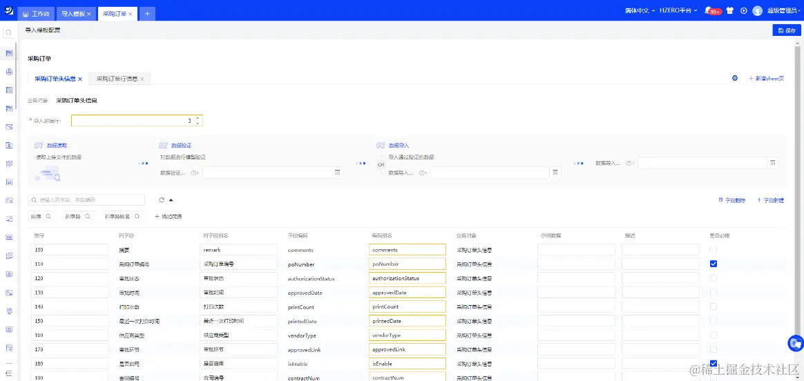 在导入模板中,新增采购订单头对象、订单行对象两个 sheet 页,并且把每个 sheet 页中需要导入的字段配置好即可。