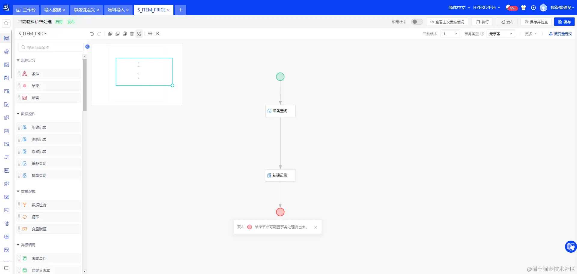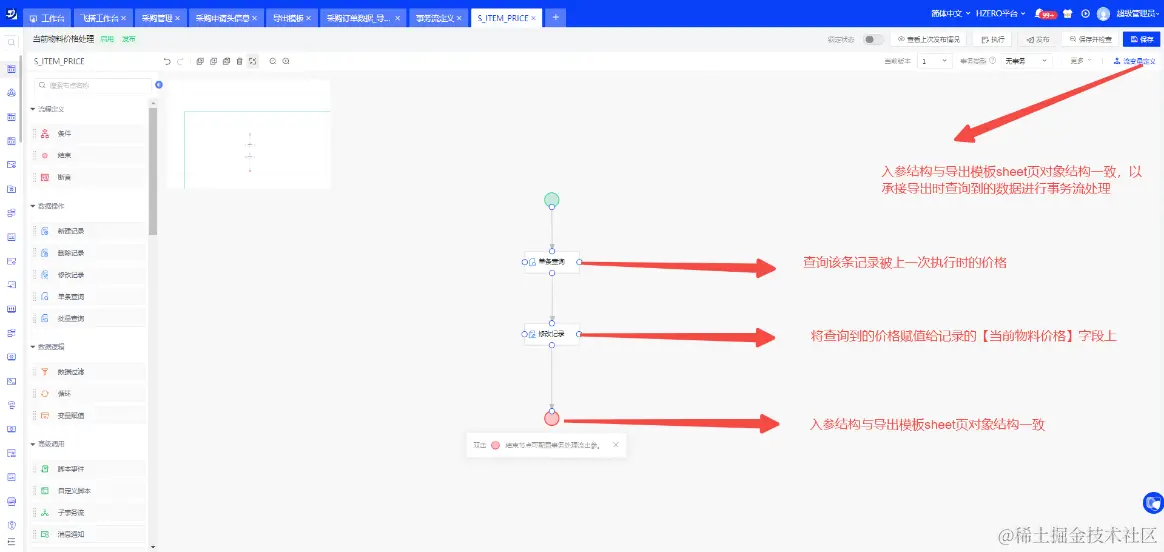 - 事务处理流“当前物料价格处理”,完成场景中的逻辑编排;
