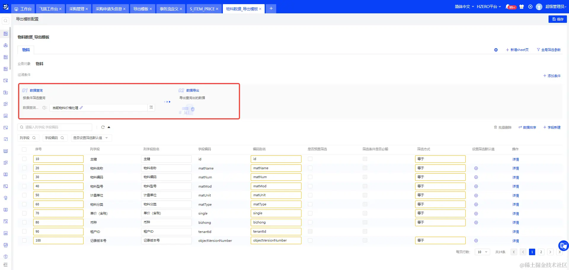 - 导出模板查询数据后调用事务处理流“当前物料价格处理”,即可在导出数据时对数据进行处理后再导出。
