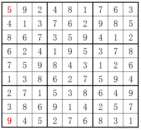 问题描述:数独(Sudoku)是一款大众喜爱的数字逻辑游戏。玩家需要根据9X9盘面上的已知数字,推算出所有剩余空格的数字,并且满足每一行、每一列、每一个3X3 粗线宫内的数字均含1-9,并且不重复。