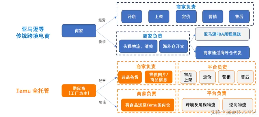 Temu在业内首创全托管模式,让平台商家只需要将商品运送至平台境内仓库,余下的跨境物流、选品、定价、营销推广、客服售后等环节都由Temu完成。