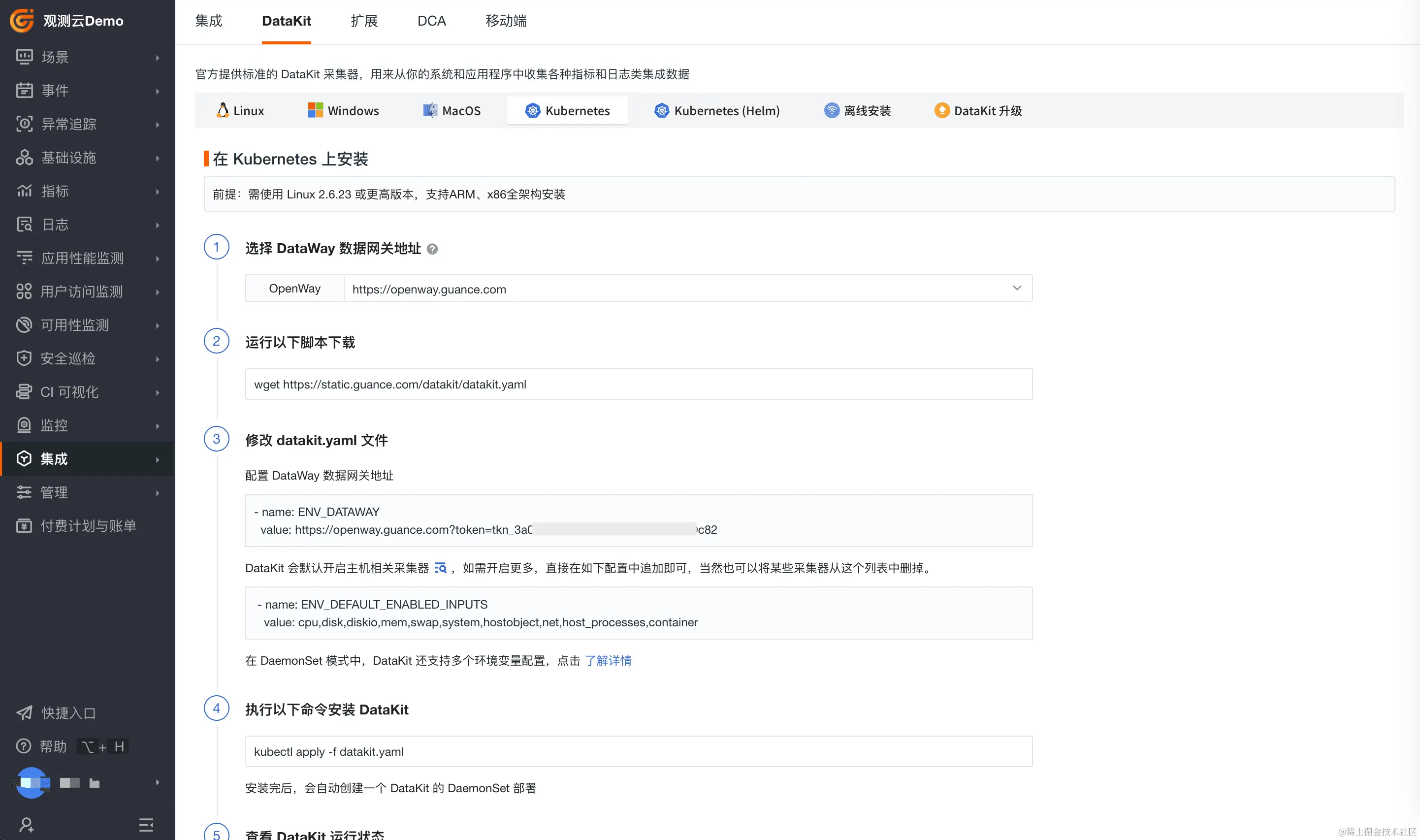 DataKit 采⽤ k8s Daemonset 控制器管理,用于采集和接收指标、日志、链路等数据。进入观测云控制台-「集成」-「DataKit」- 「Kubernetes」或 「Kubernetes(helm)」,支持 yaml 或 Helm 方式安装 DataKit。