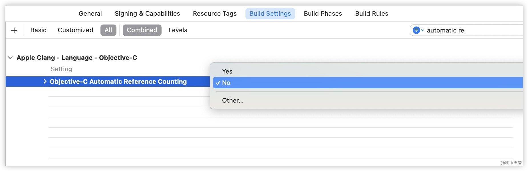 这是因为,现在项目默认是启用ARC的,ARC下会自动帮我们添加copy操作(具体规则后面章节讲),我们先把项目设置为MRC