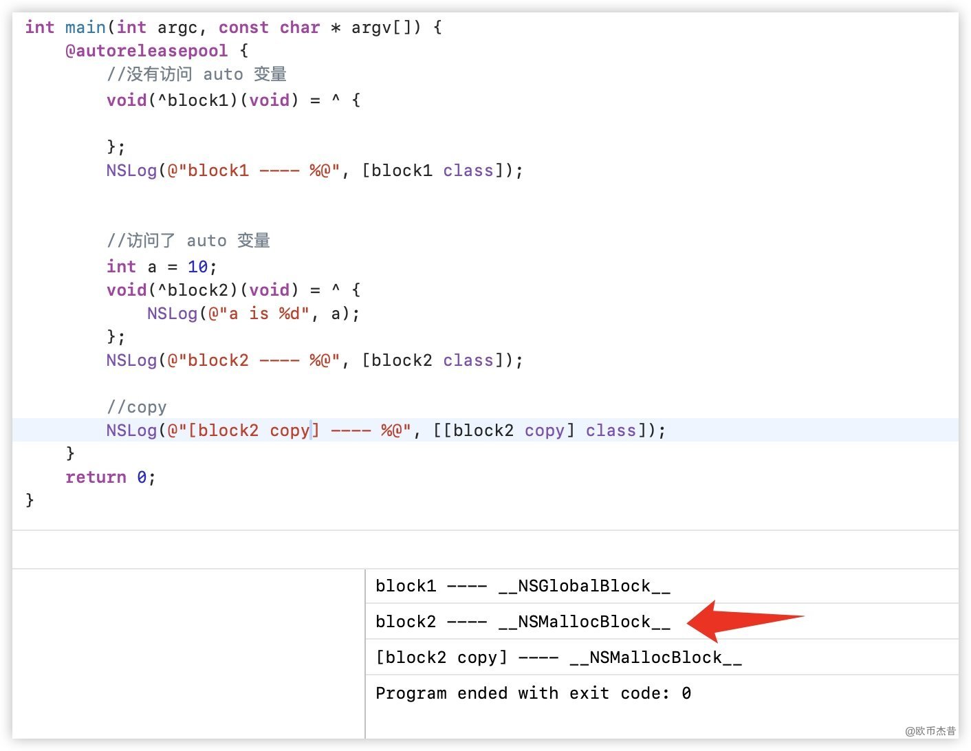 我们已经知道,访问了auto变量的block是NSStackBlock类型,__NSStackBlock__调用了copy后是NSMallocBlock