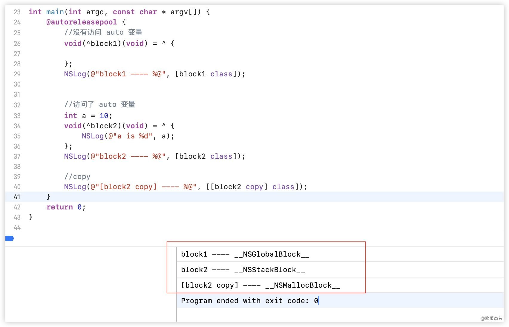 通过下面示例,验证了block作为函数返回值时是__NSMallocBlock__,直接创建打印则是__NSStackBlock__
