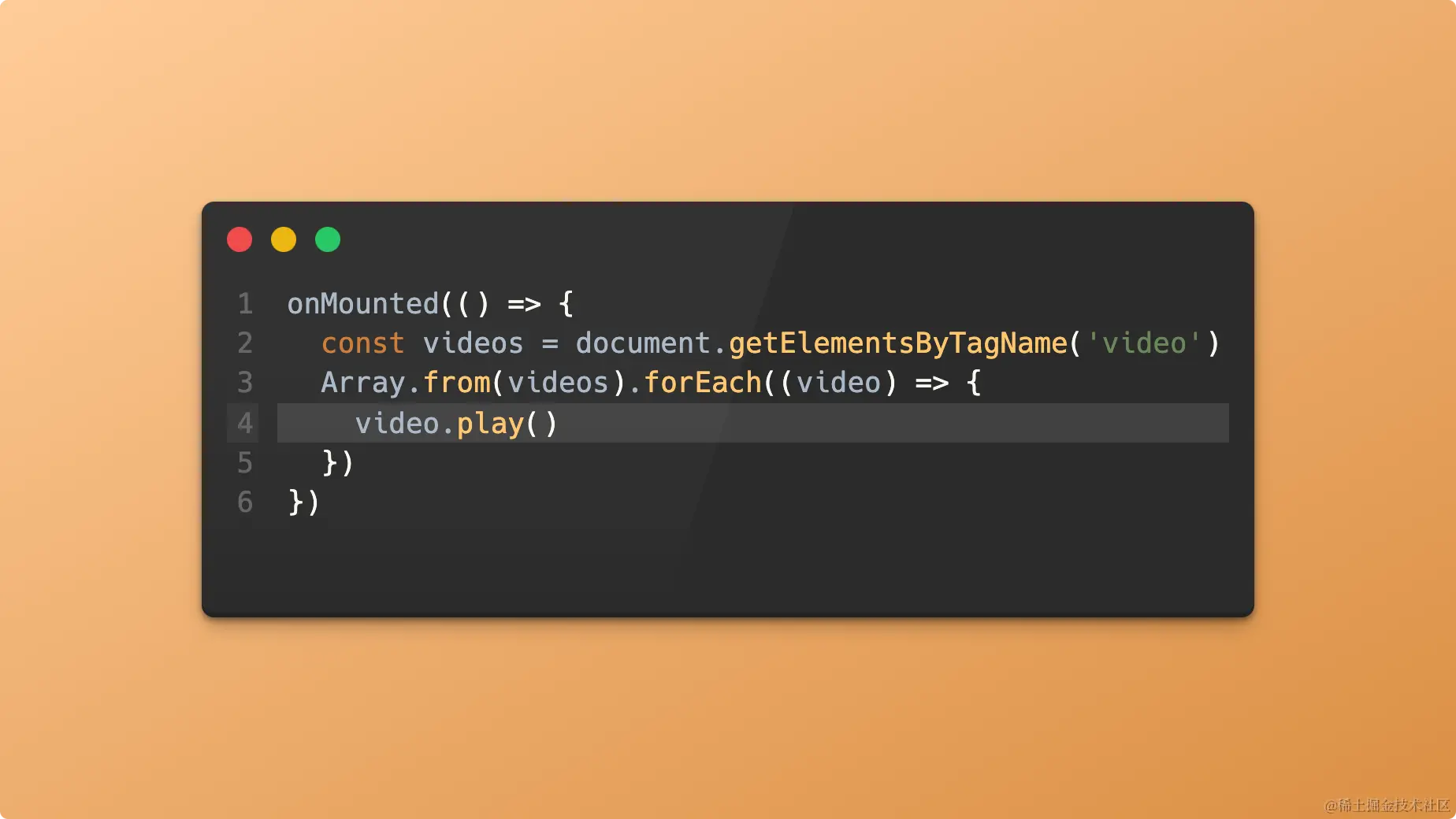 在 Vue 挂载完成之后,通过 document.getElementsByTagName('video') 去拿到首页的所有视频元素,再依次触发播放事件,如此就能够在切换路由再切回首页时,视频仍能够保持自动播放。