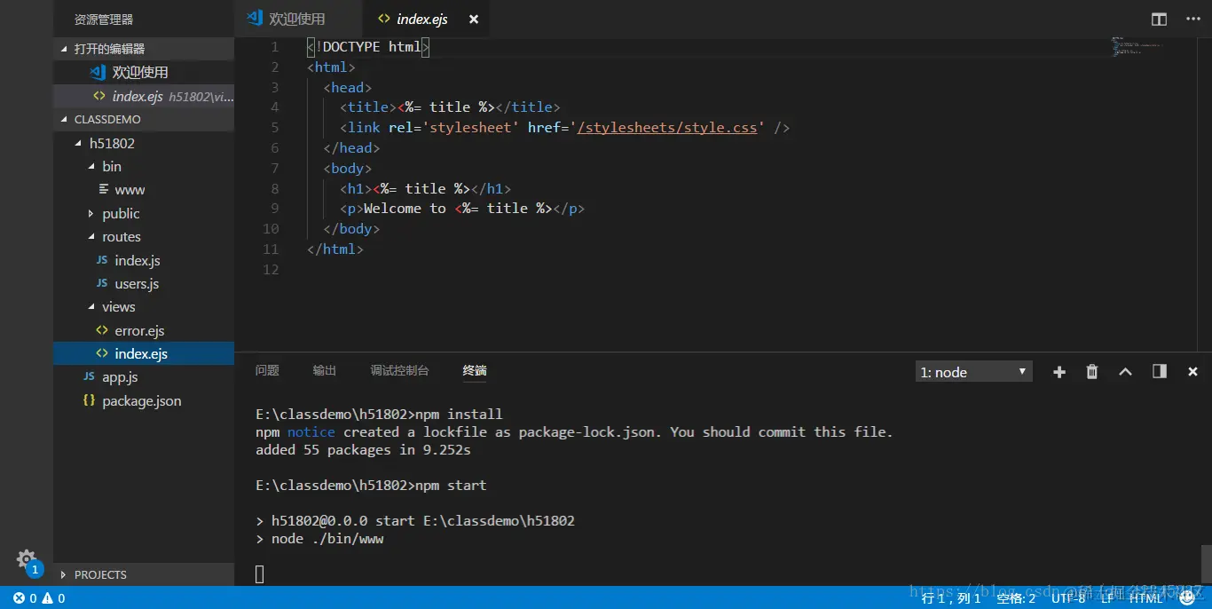 express h51802(如果要在创建时使用ejs模板就在中间加一个-e。如:express -e h51802)如图: