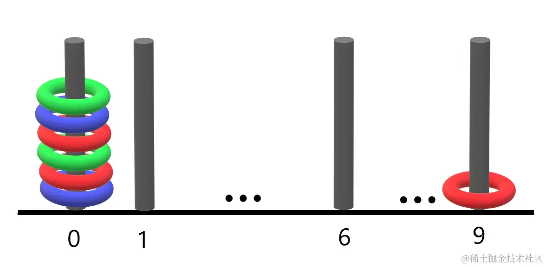 - 编号 0 的杆上有 3 个环,集齐全部颜色:红、绿、蓝。