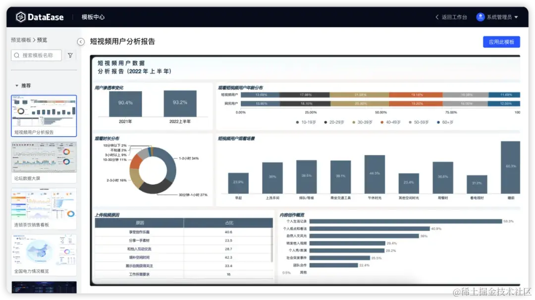 DataEase通过内置的模板市场为用户提供了丰富的业务场景模板。在制作大屏时,用户往往面临数据呈现和视觉效果无法双重满足的困惑,DataEase模板市场(templates.dataease.cn/ )提供了100多款高质量的免费大屏模板,覆盖制造、零售、电商、金融、医疗、教育、交通、物流等行业,协助用户快速制作精美的数据大屏。
