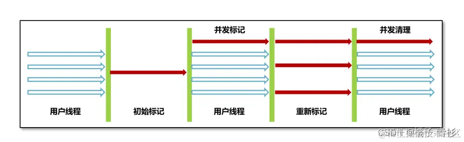 - 并发标记:在这一阶段,垃圾回收线程与用户线程同时执行,标记所有存活的对象。这样可以在不影响用户线程执行的情况下完成对象标记工作。