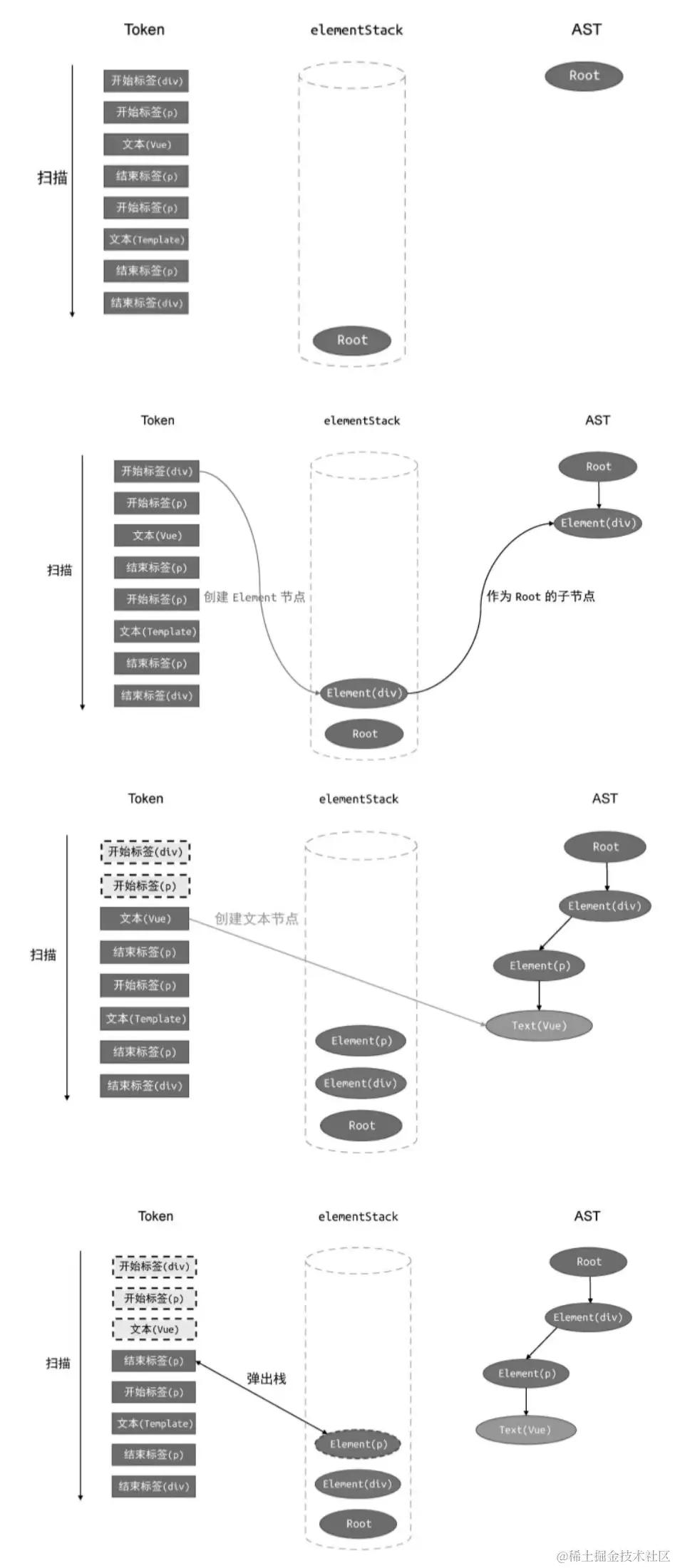 每遇到一个开始标签节点,我们就将其压入栈中,遇到结束节点,就将其从栈中弹出。扫描过程中遇到的所有子节点,都会作为当前栈顶节点的子节点,并添加到栈顶节点的children属性下。