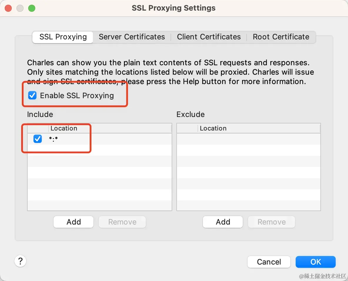 - 开启https请求抓包,Proxy-> SSL Proxying Settings,开启SSL Proxying,如下图配置。