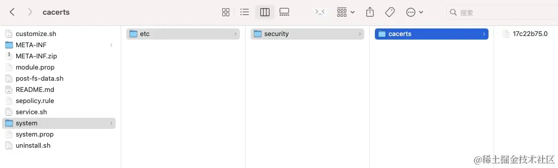 system/etc/security/cacerts/目录下。 - 将所有文件压缩成个zip包,注意,zip压缩包中customize.sh,META-INF等这些文件是处于根目录。