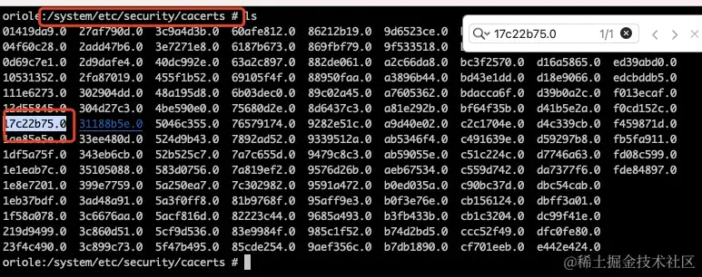openssl x509 -subject_hash_old -in xxx.pem,其中xxx.pem为1中保存下来到本地的.pem文件。输入上面命令后可以看到一个八位的十六进制数字,如下图。