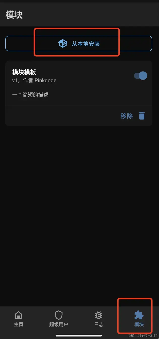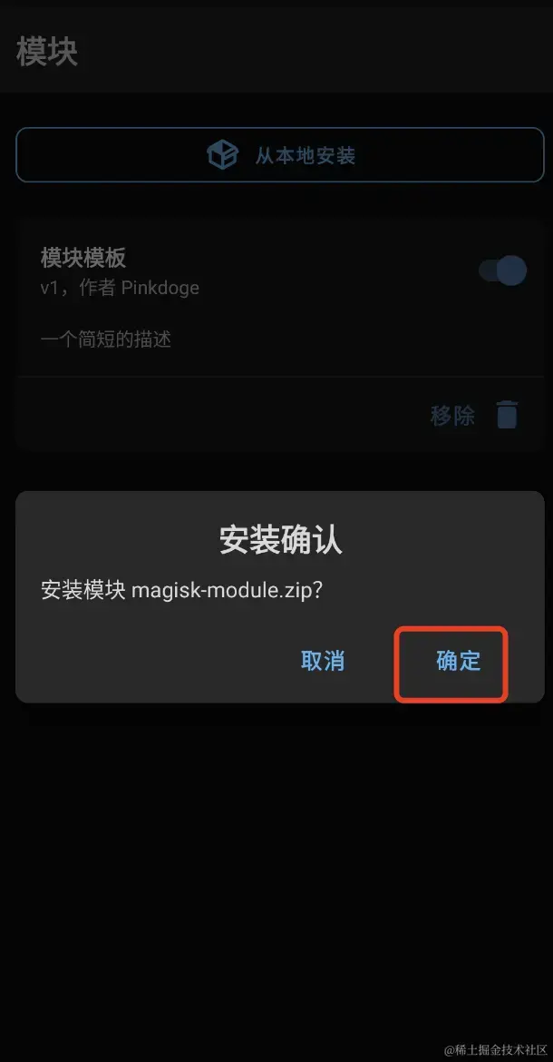 - 打开Magisk,"模块" -> "从本地安装",选择上面制作成功的zip包,确认安装,分别如下图。