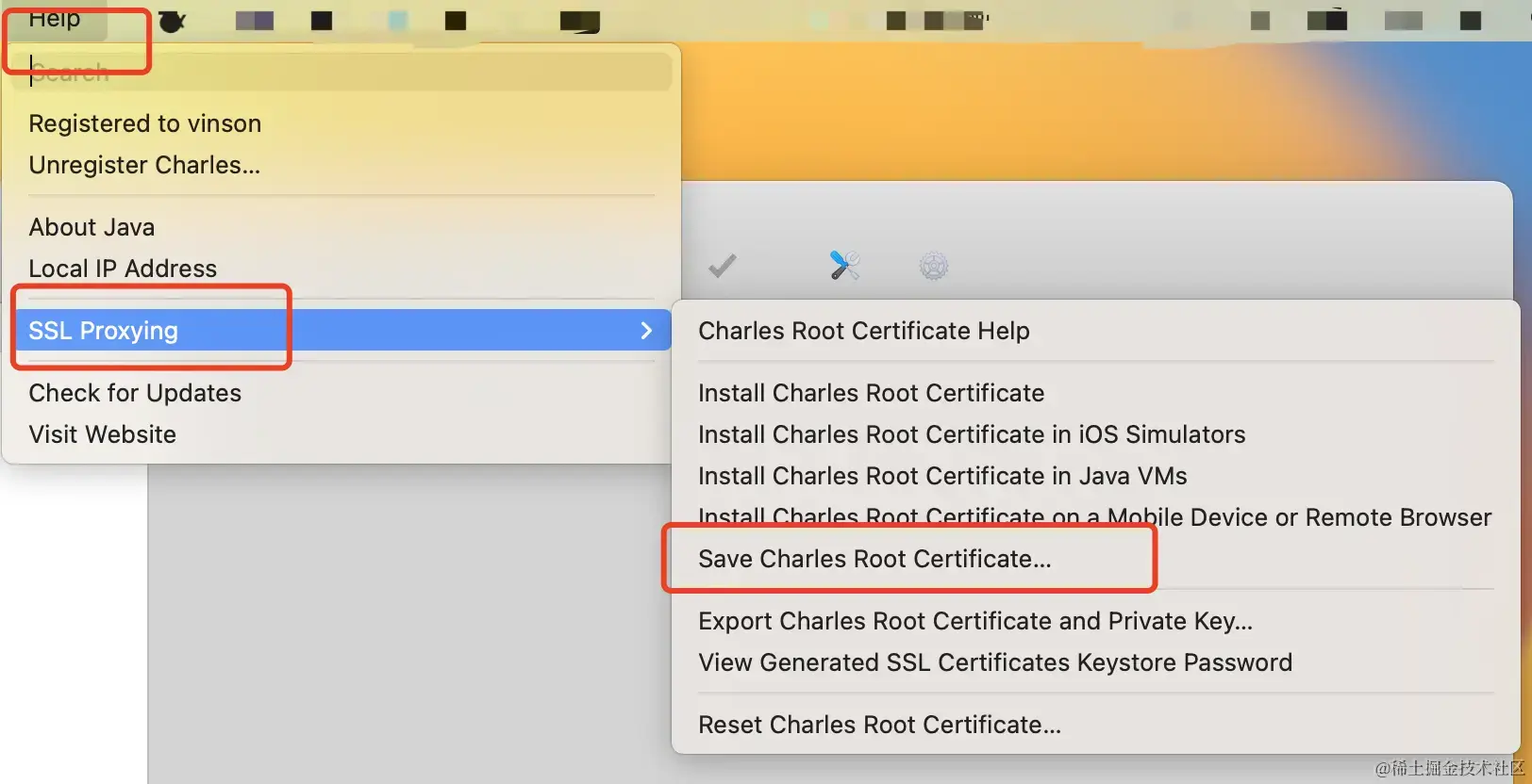 - 打开charles软件,并保存证书,Help->SSL Proxying -> Save Charles Root Certificate。下载完本地会存在一个.pem文件,如下图。