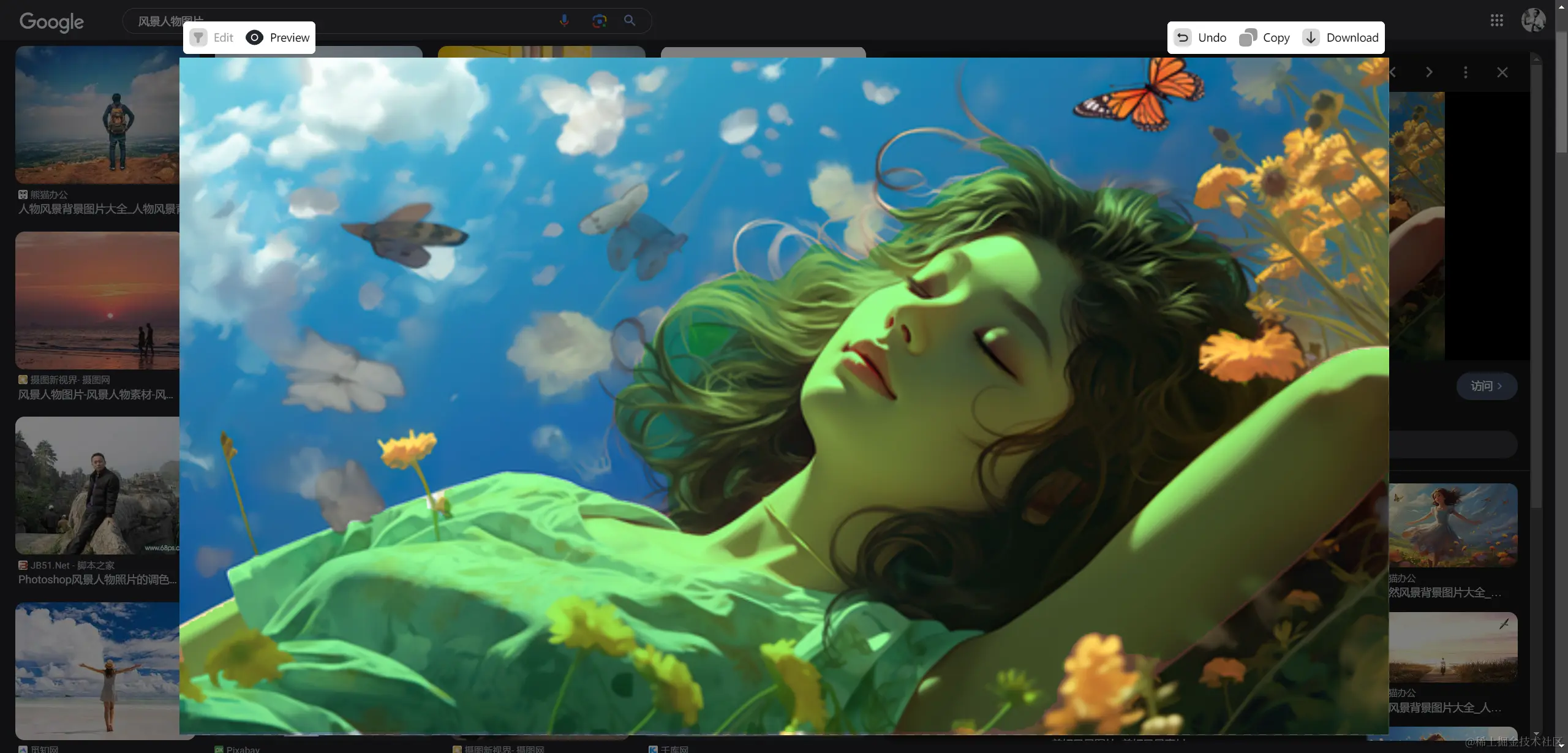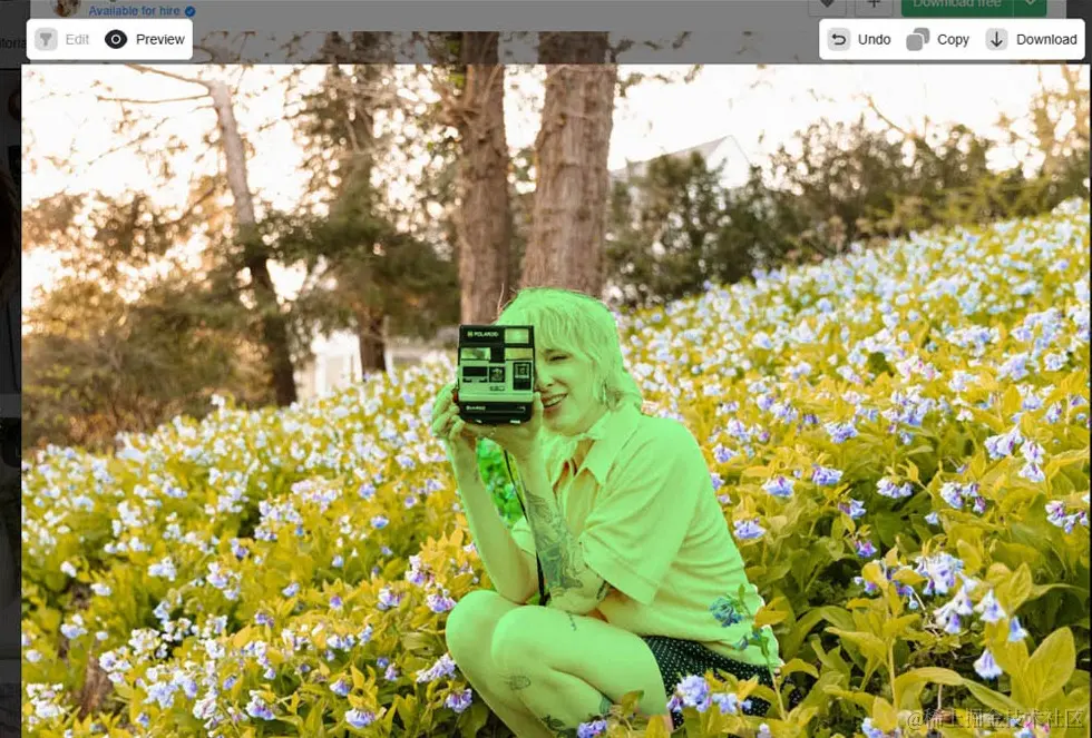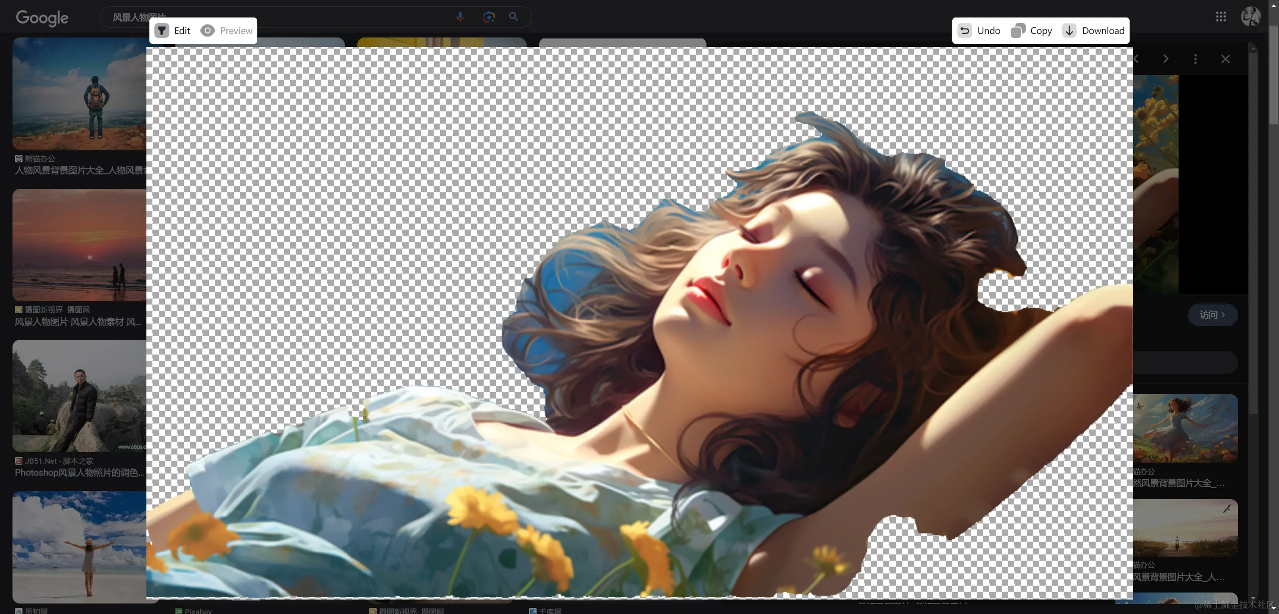 但即便如此,因为体量的关系,Magic Copy也是存在着不足的:在面对拥有着复杂背景的图片时,智能抠图的效果其实并不让人满意。如下图,两手臂之间的花朵也在去背景的范围内,而抠图扩充功能又并未提供去除范围之类的功能,只能在Undo恢复至上一步。因此,Magic Copy实际上并不太适合用在背景复杂的图片上面。