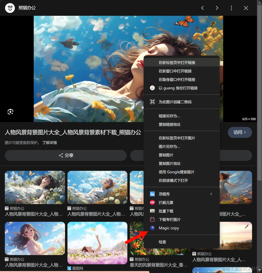 安装完成后,右键网页中的任意一张图片,选择Magic Copy。加载完成后,选择需要抠出的部分,点击右上角的Copy就可以把抠图结果存入剪切板。