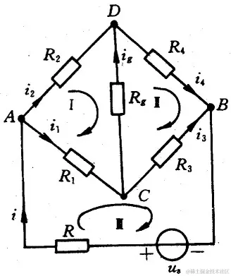 AB支路为电源支路,CD支路为桥路,试用支路电流法求电流ig, 并讨论电桥平衡条件。