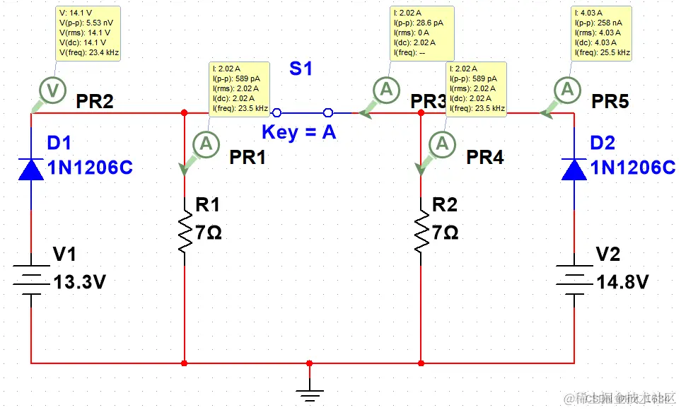 开关电源V1由V1与D1组成,开关电源V2由V2与D2组成,当S1闭合后,V1已经不再给负载R1、R2供电,由V2供给。仿真电路:双电源供电multisim仿真。