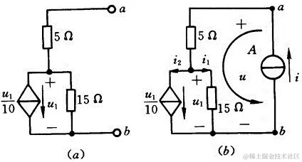 在ab端外施电流源 i, 设电压 u 使 u、i 对二端电路来说参考方向关联, 并设电流 i1、i2 参考方向如(b)图上所标