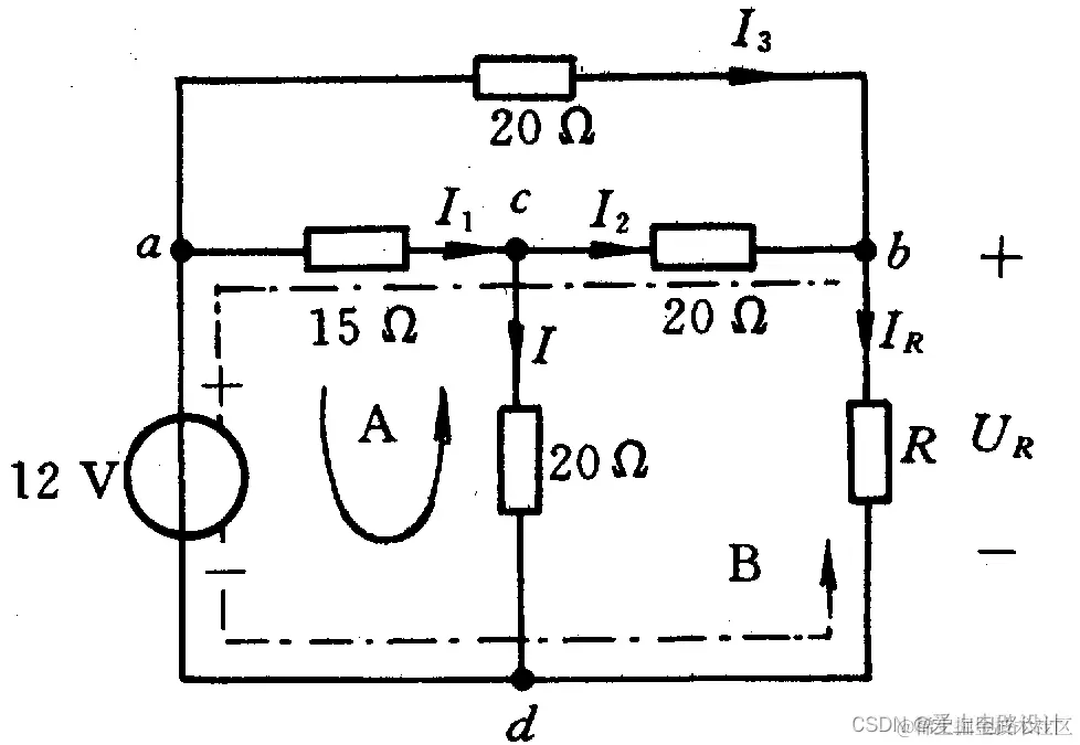 根据KVL从a点开始沿图上虚线得:12V-UR-2V-6V=0,UR=4V,注: 电流方向与巡回方向相反取负