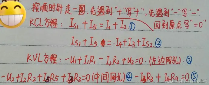 电流方向与巡回方向一致取正,电流方向与巡回方向相反取负;遇到电压降低的电源取正;遇到电阻上的电压降低(实际上习惯的电流是与巡回方向一致的),当然也取正。