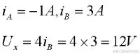 Vx = 4A(6Ω//3Ω) = 8V,Uab = 8V+4V = 12V。*