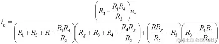 当ig=0, 即桥路上电流为零(或桥路两端电压:uCD=0)时称该电桥达到平衡。由 ig 的表示式可知分母是有限值,因而仅当R3=R1*R4/R2,即R1/R2=R3/R4时 ig=0, 这就是电桥平衡的条件。
